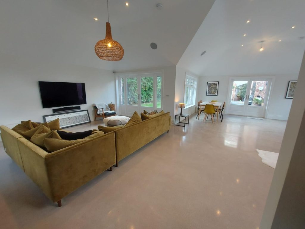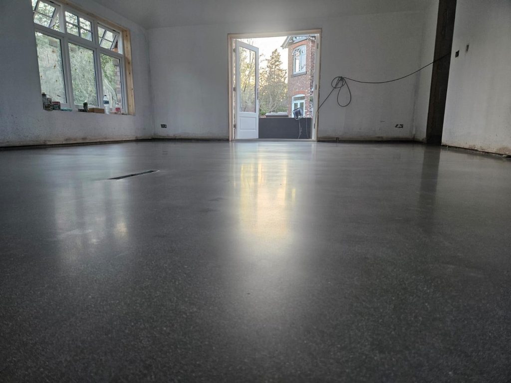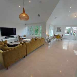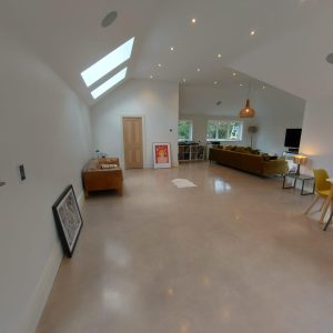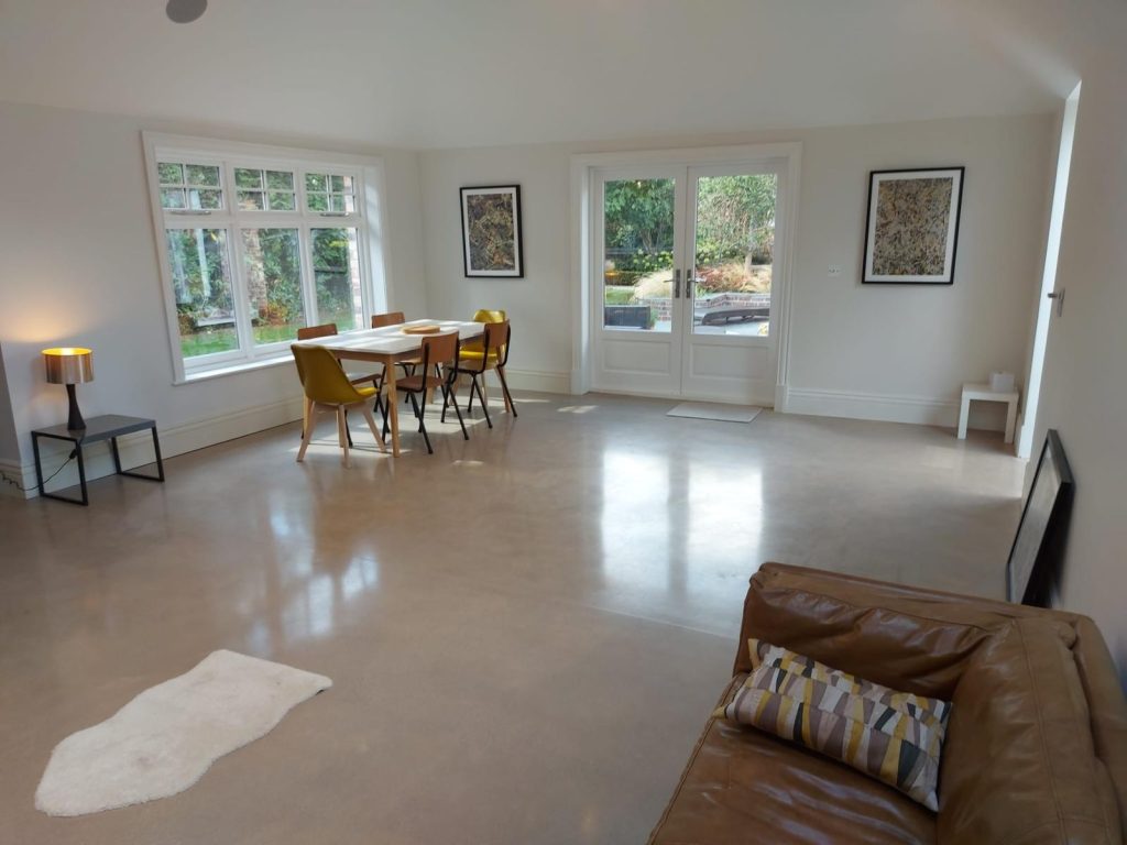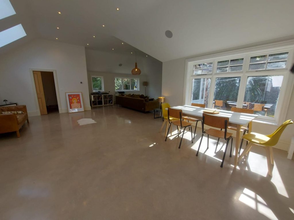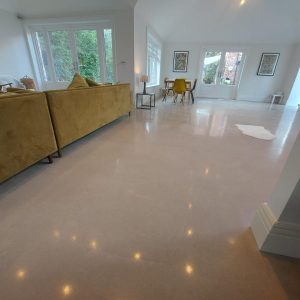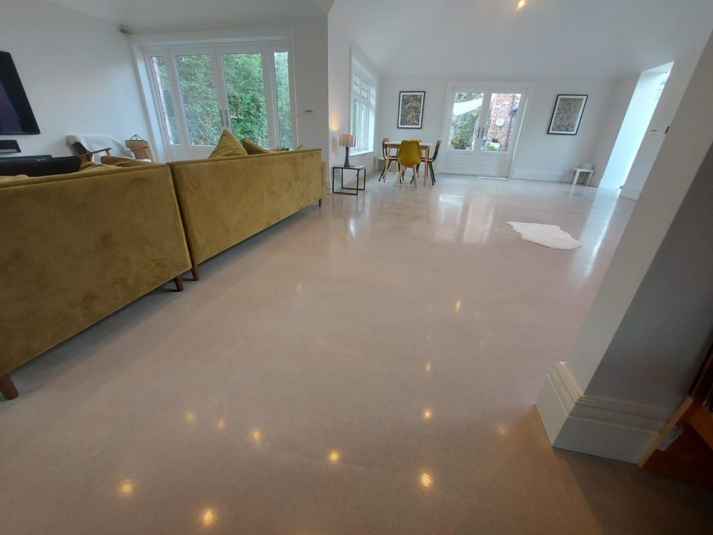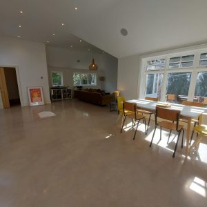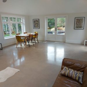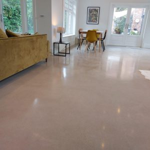 Concrete Polishing supplied, placed and polished this residential polished concrete project in Wilmslow, Cheshire. The client opted for a conventional concrete mix, stone buff colour added to the design with a rustic style finish.